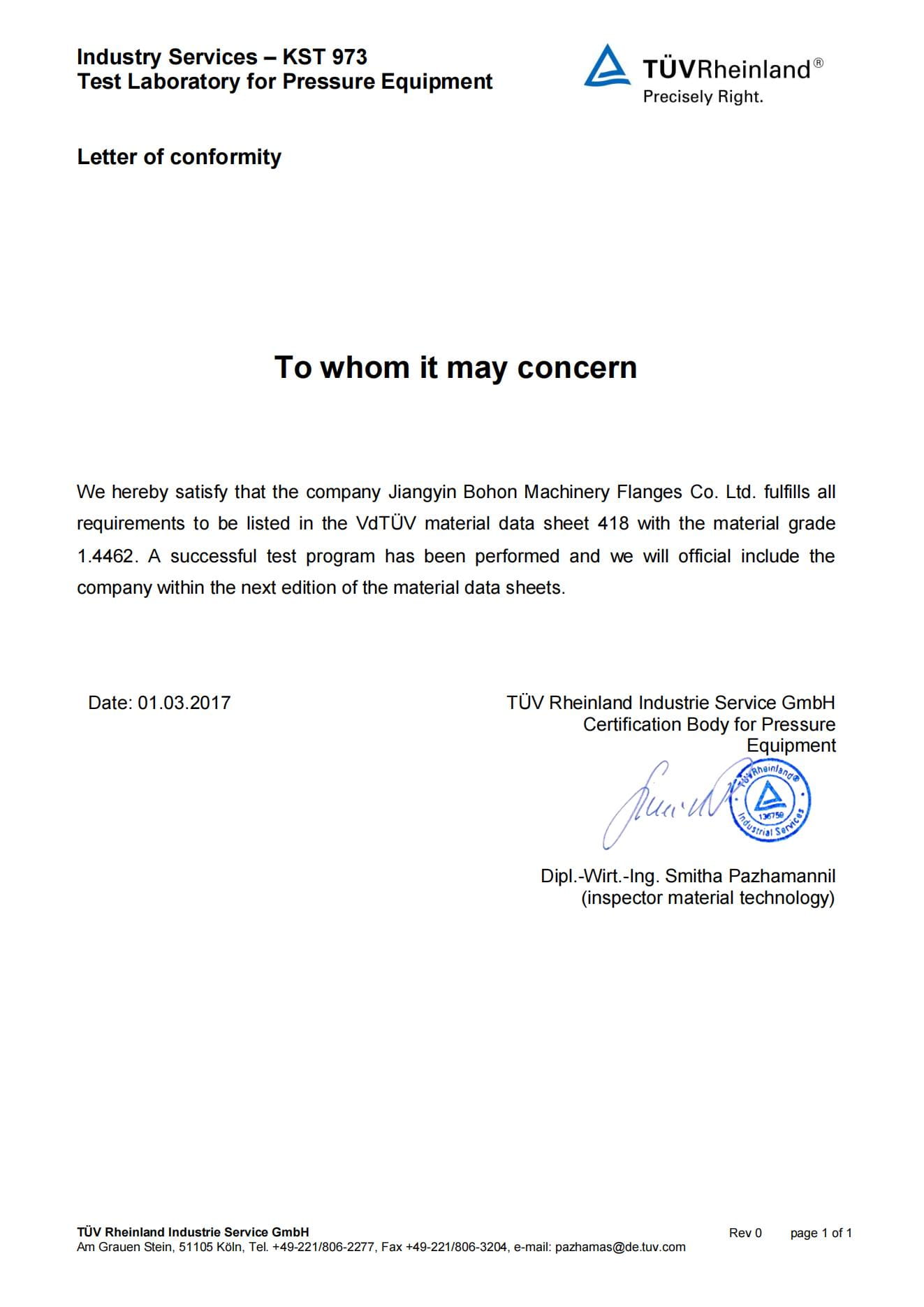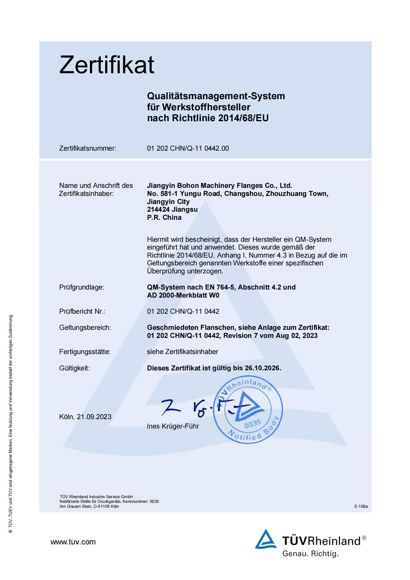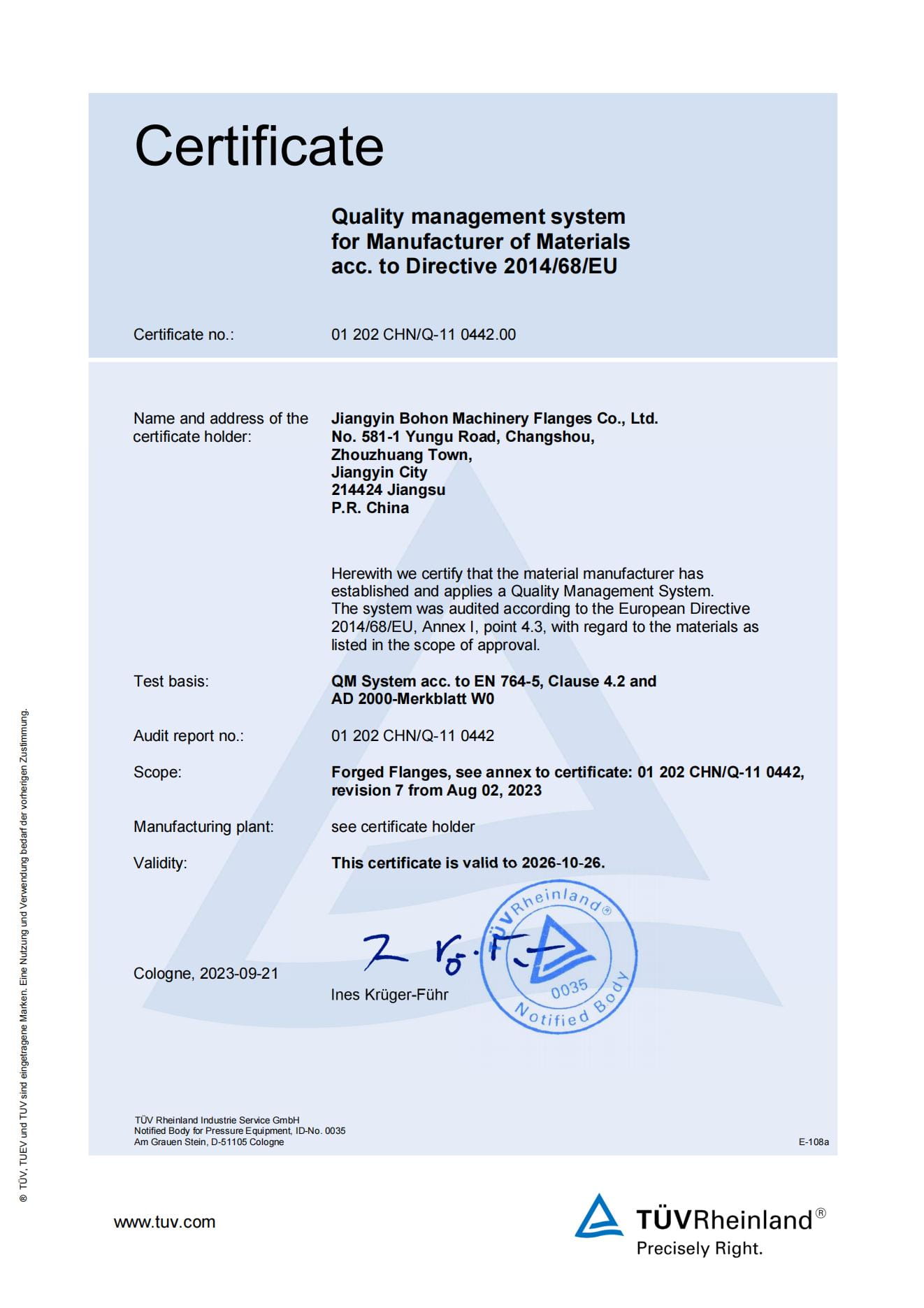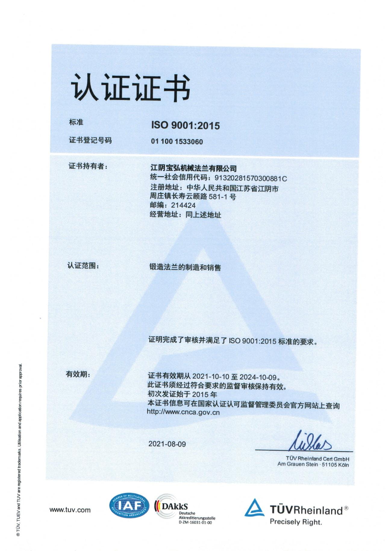As a manufacturer specialized in stainless steel flanges, the Company has passed ISO-9001:2008 quality system certification; TUV PED 97/23/EC & AD2000-W0/TRD 100, DNV, BV, ABS and other certifications as well as special equipment manufacturing license certification.