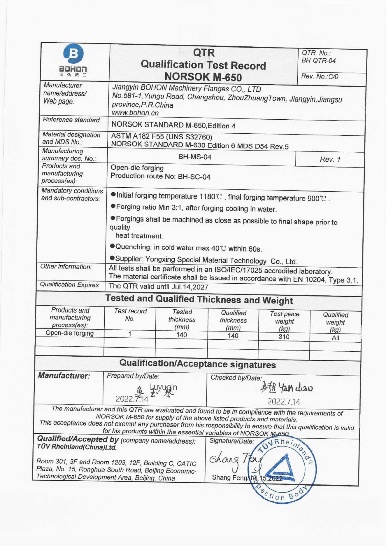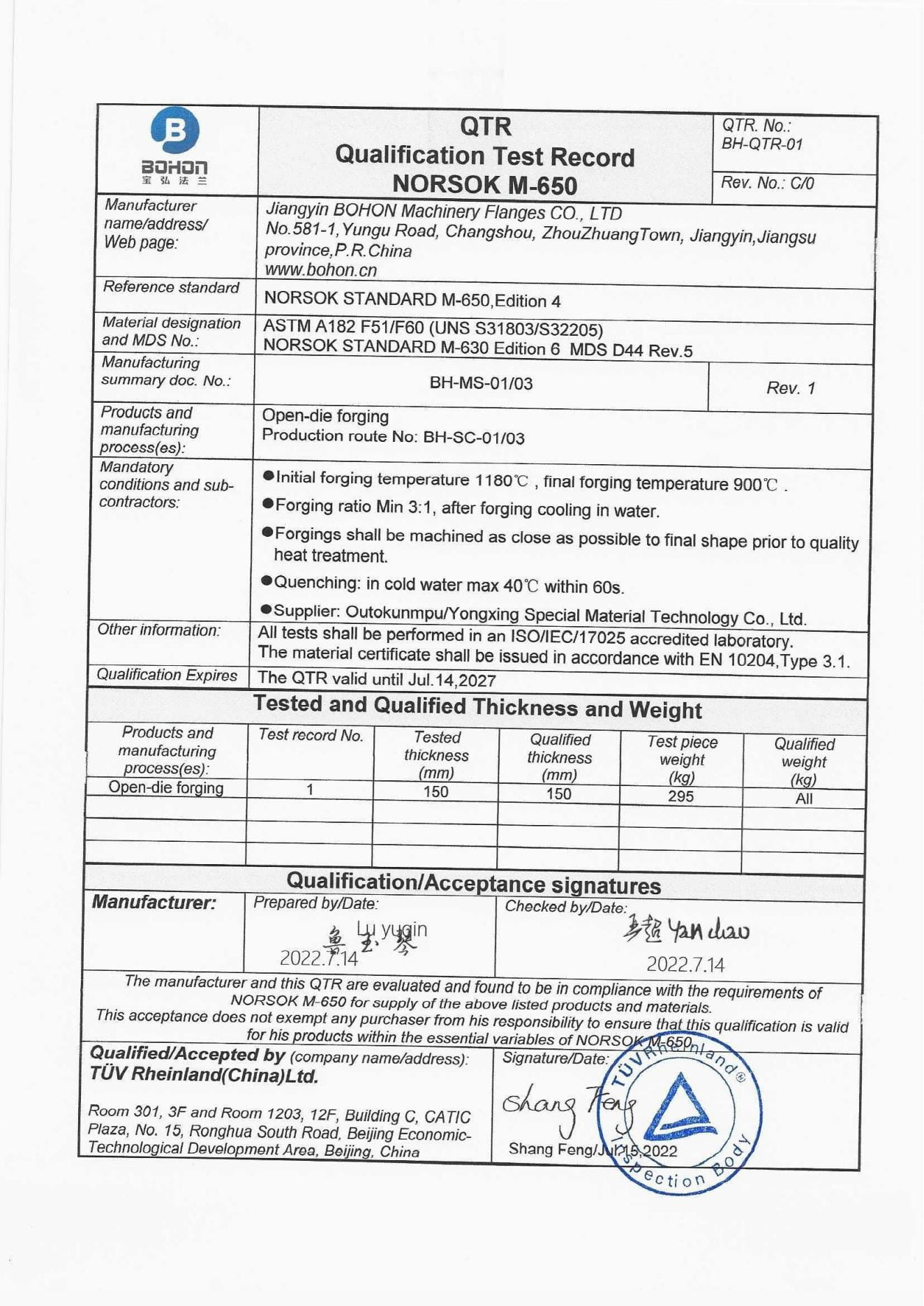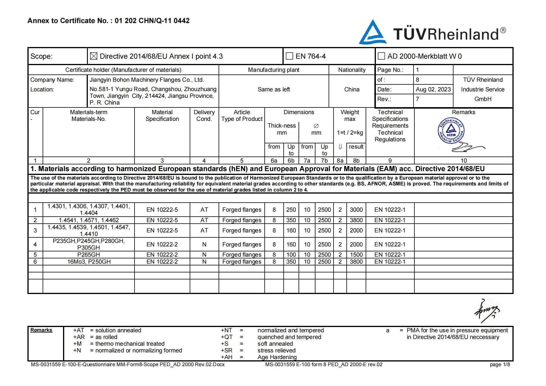 As a manufacturer specialized in stainless steel flanges, the Company has passed ISO-9001:2008 quality system certification; TUV PED 97/23/EC & AD2000-W0/TRD 100, DNV, BV, ABS and other certifications as well as special equipment manufacturing license certification.