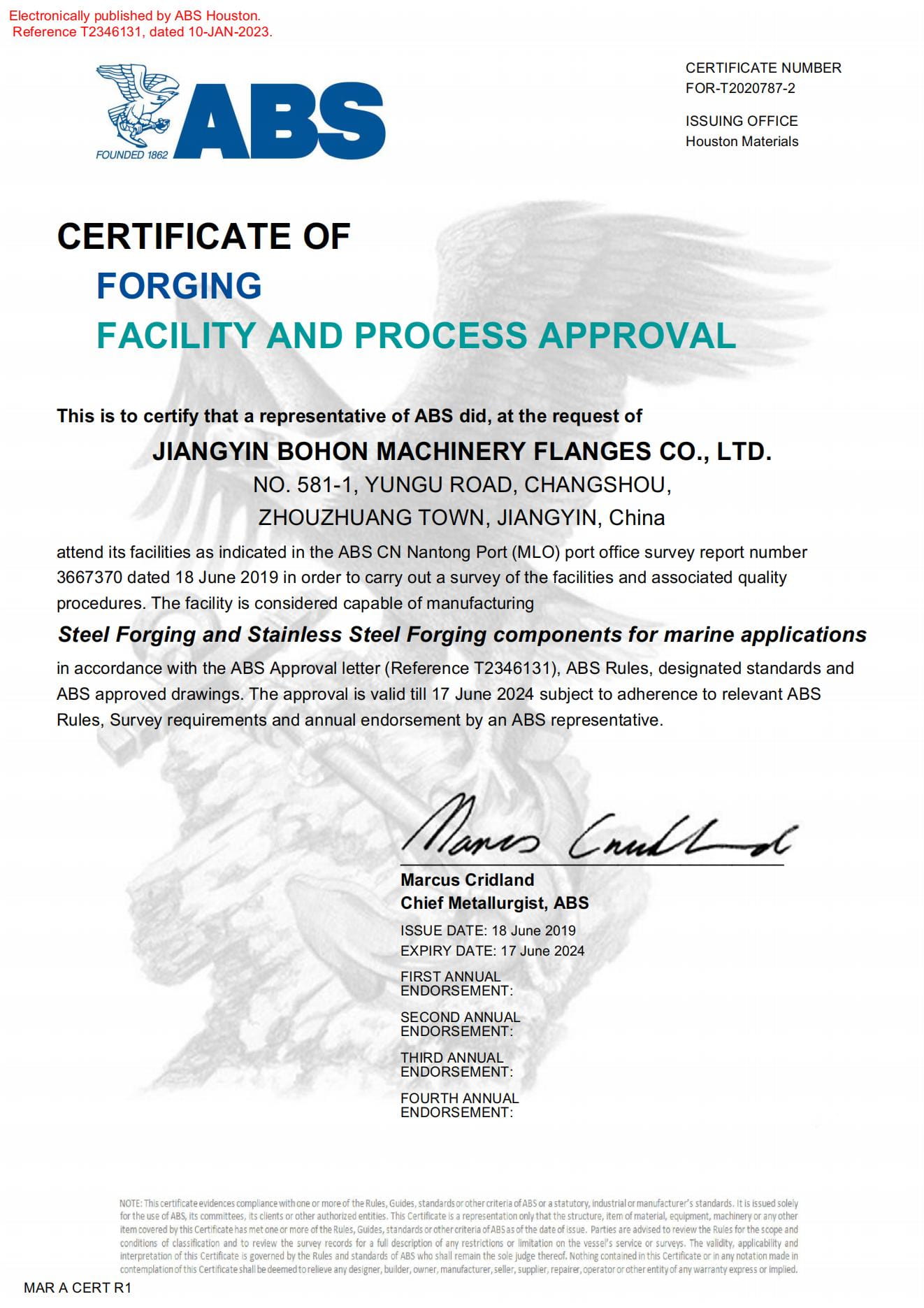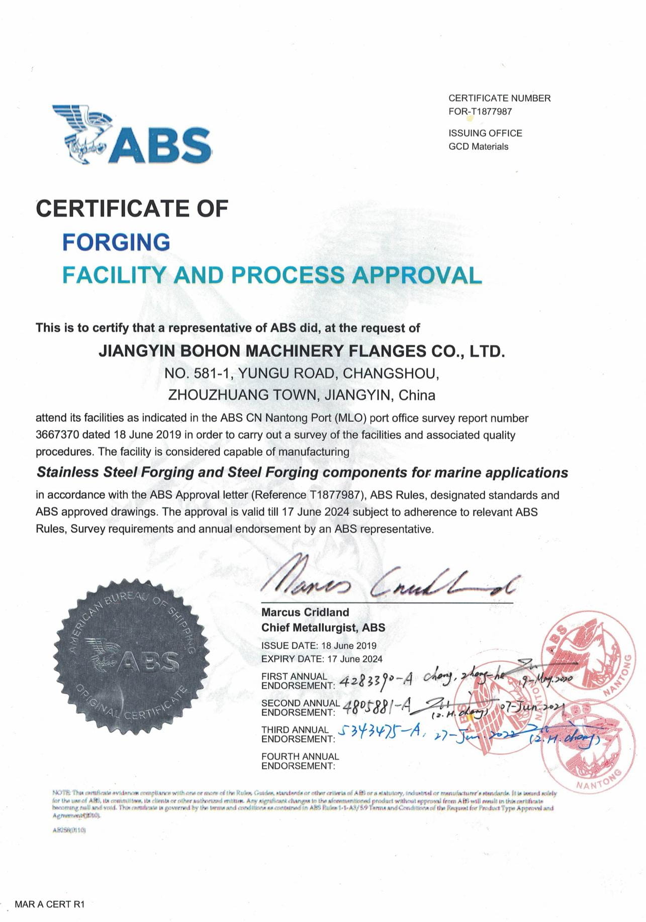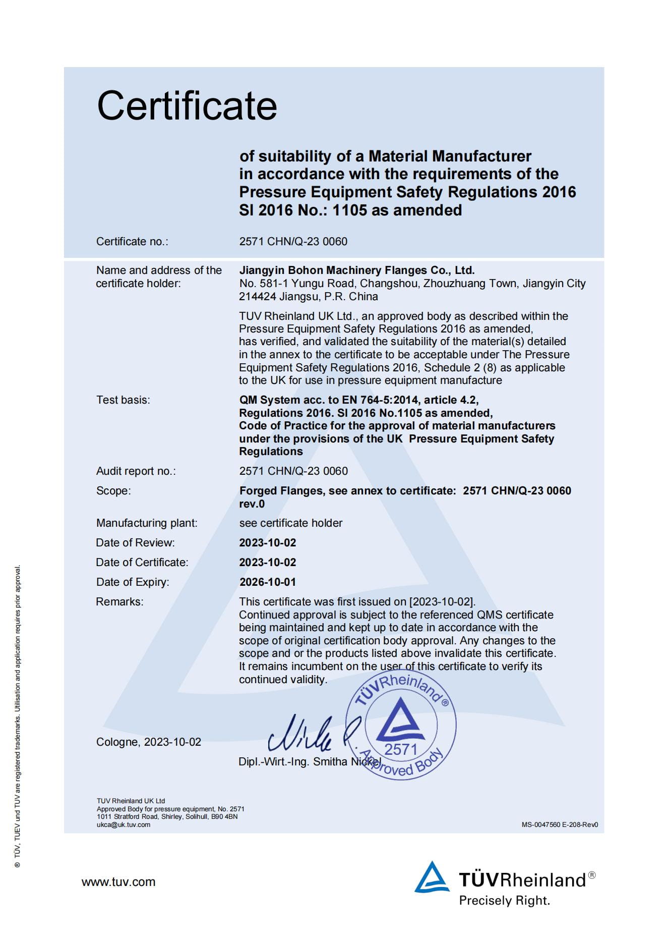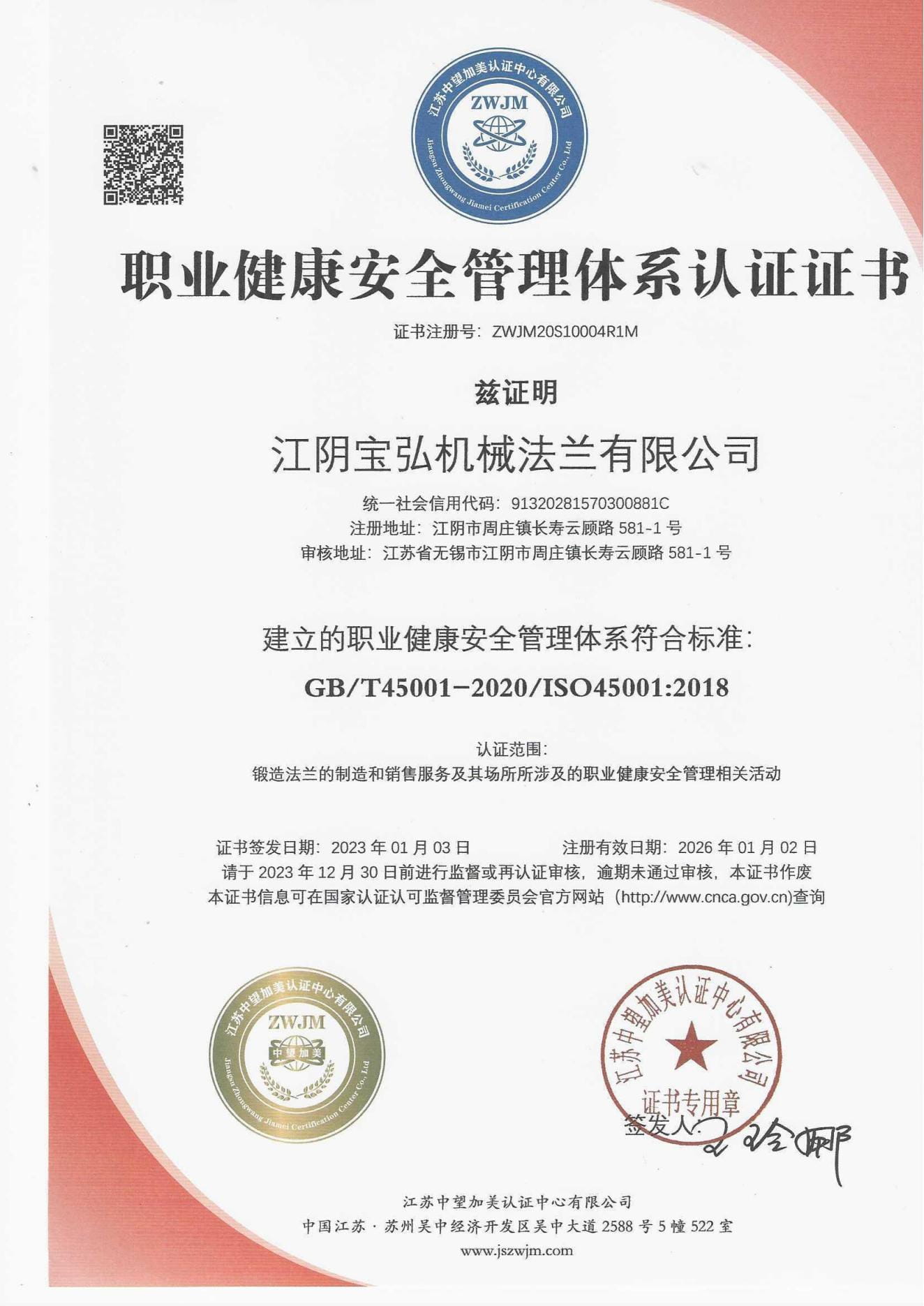 As a manufacturer specialized in stainless steel flanges, the Company has passed ISO-9001:2008 quality system certification; TUV PED 97/23/EC & AD2000-W0/TRD 100, DNV, BV, ABS and other certifications as well as special equipment manufacturing license certification.